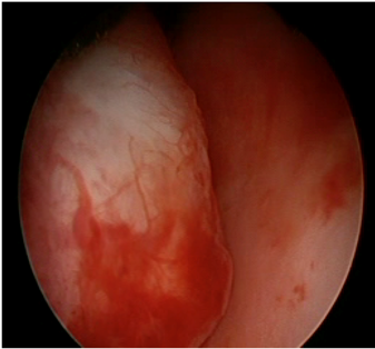 Вигляд аденоми передміхурової залози при ендоскопії: вузол аденоми (А) випинає у просвіт сечівника (ПС), перешкоджаючи огляду порожнини сечового міхура та утруднюючи відтік сечі з сечового міхура