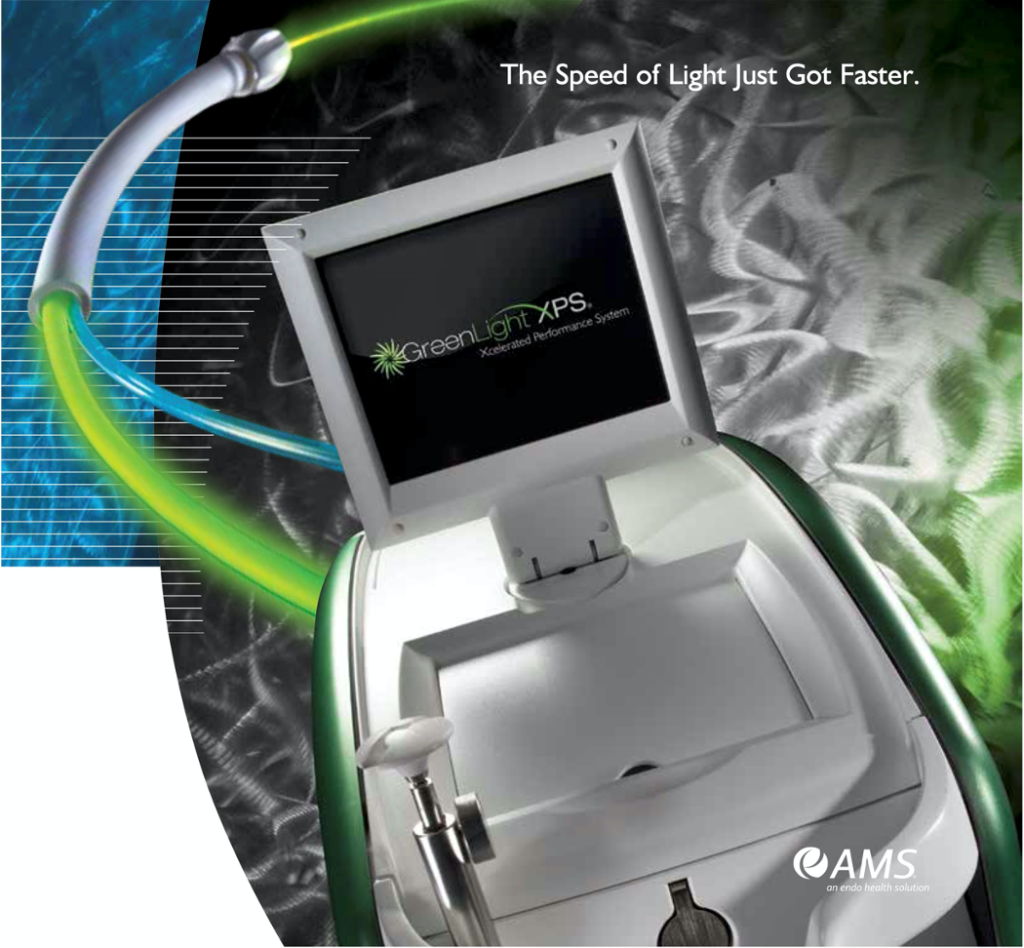 Система GreenLight XPS – це не просто модернізація апарату попереднього покоління, а пристрій, що вібрав в себе грунтовні удосконалення, які дозволяють проводити процедуру на якісно новому рівні. Система GreenLight XPS генерує зелене лазерне випромінювання з довжиною хвилі 532 нм, що вибірково поглинається еритроцитами (червоними кров’яними тільцями) та судинами. На додаток до цієї унікальної властивості була збільшена потужність GreenLight XPS до приголомшливих 180Вт та оптимізоване лазеропровідне волокно, шляхом інтеграції в нього власної системи охолодження, збільшення його енергетичного ресурса та площі контакта лазерного пучка з пухлиною.. Збільшення потужності та якості лазерного випромінювання разом з підвищенням стійкості волокна до термічних навантажень дозволяють проводити видалення пухлин великіх розмірів (>120см3) за більш короткий час, додатково підвищуючи якість та безпечність процедури.